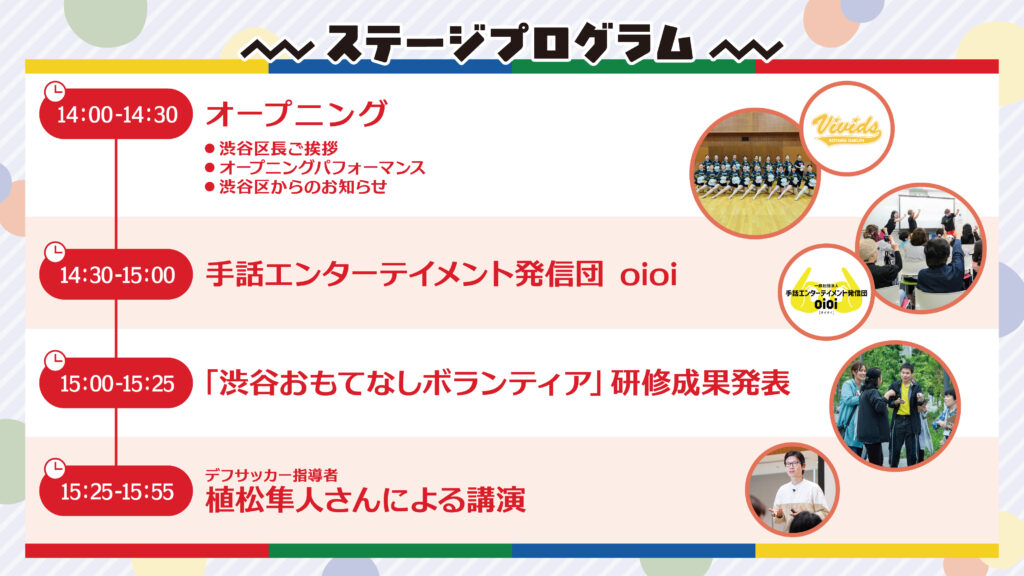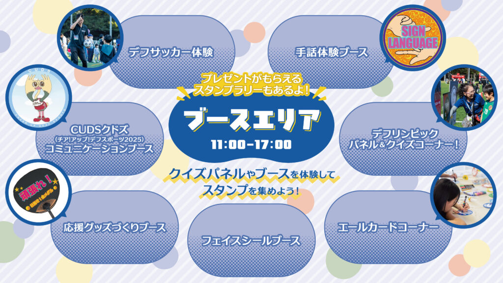 本イベントでは、手話や筆談など多様なコミュニケーション方法を知り、デフスポーツの魅力を体験できるブースを展開します。また、地域の学生や団体と連携し、手話体験やフェイスシール体験など来場者参加型の企画も多数実施。ステージでは「手話エンターテイメント発信団oioi」によるパフォーマンスや、デフサッカー指導者・植松隼人氏の講演を通して、音のない世界の魅力やデフリンピックの意義を発信します。