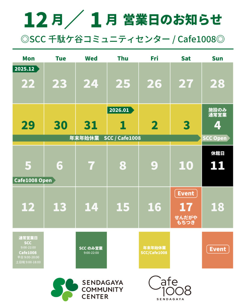 いつも当施設ならびにCafe1008をご利用いただき、誠にありがとうございます。 2025年〜2026年の年末年始の営業スケジュールをお知らせいたします。期間中、施設とカフェで営業日が異なりますのでご注意ください。■休業期間2025年12月29日(月) 〜 2026年1月3日(土)※SCC・Cafe1008ともにお休みとなります。■年始の営業について・SCC(コミュニティセンター):1月4日(日) 9:00より通常営業・Cafe1008:1月5日(月) 9:00より通常営業(※4日はカフェのみお休みですのでご注意ください)■1月のスペシャルイベント! 「せんだがや もちつき」開催決定みんなで餅つきして、食べて新年を祝いましょう!日時:1月17日(土)参加費:無料本年も残りわずかとなりましたが、皆様のご来館を心よりお待ちしております!