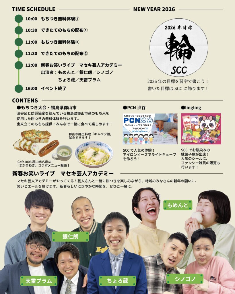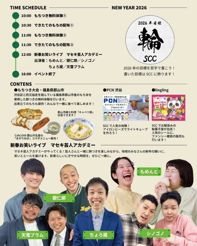 福島県郡山市産のお米を使ったもちつきを、芸人さんと一緒に盛り上げながら体験。地域のみなさんが書いた新年の願いには、マセキ芸人アカデミーの芸人さんたちが、笑いとエールを届けます。習字で2026年の目標を書くコーナーも開催。書いてくれた目標は、SCCに飾ります。